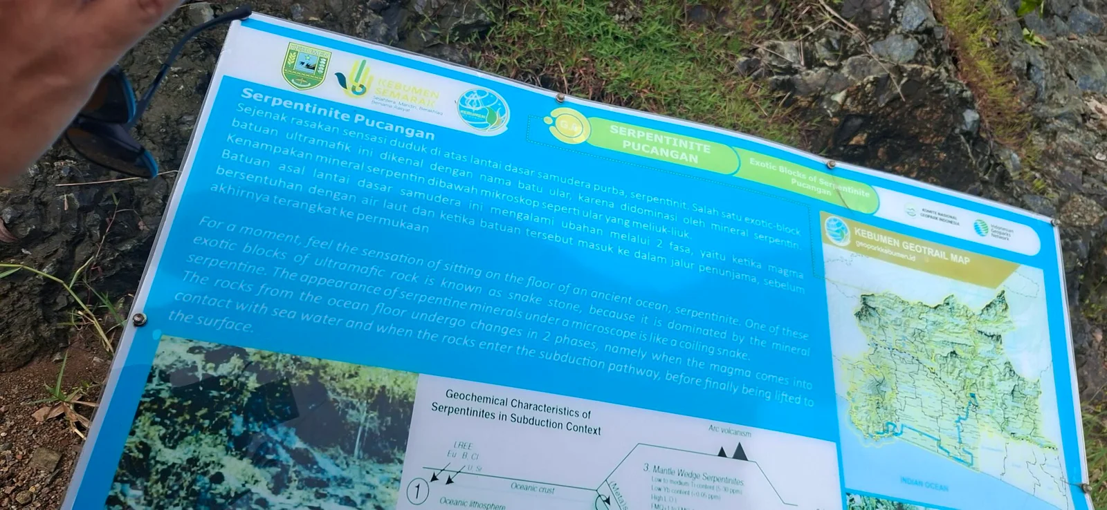 “Sejenak rasakan sensasi duduk di atas lantai dasar samudera purba, serpentinit. Salah satu exotic-block batuan ultramafik ini dikenal dengan nama batu ular, karena didominasi oleh mineral serpentin. Kenampakan mineral serpentin dibawah mikroskop seperti ular yang meliuk-liuk.